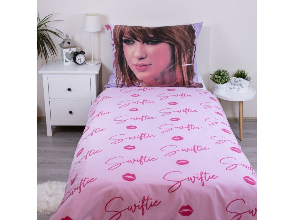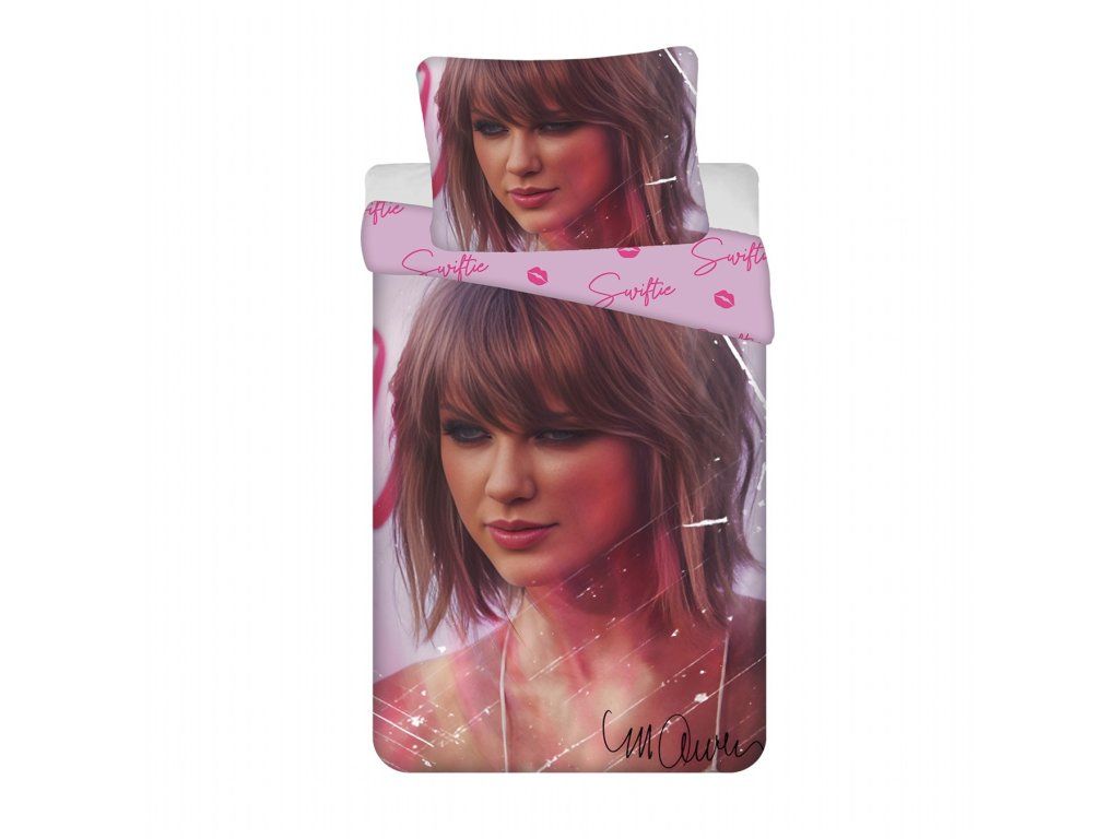 Na povlečení je vyobrazen portrét Taylor Swift, který dominuje celému designu. Polštář i přikrývka jsou zdobeny růžovými nápisy "Swiftie" a malými otisky rtů, což dodává celému setu hravý a stylový vzhled.