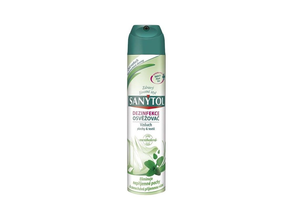 Sanytol dez.osvěž.vzduchu-mentolová vůně 300 ml Dezinfekční osvěžovač vzduchu, povrchů a textilií s mátovou vůní. SANYTOL vyčistí vzduch a vydezinfikuje povrchy v jednom jediném kroku. Jeho složení zajišťuje dokonalou hygienu a zanechává příjemně svěží vůni. Zahubí 99,9 % bakterií, plísní a virů, včetně viru chřipky typu A (H1N1). Dezinfikuje a čistí. Absorbuje a ničí pachy tím, že odstraňuje jejich příčinu (mikroby). Působí na vzduch, povrchy a bytové textilie. Nezanechává skvrny, k textiliím je šetrný. Příjemně provoní celou domácnost mátovou vůní. Obsah: 300 mlDoplňkové parametry