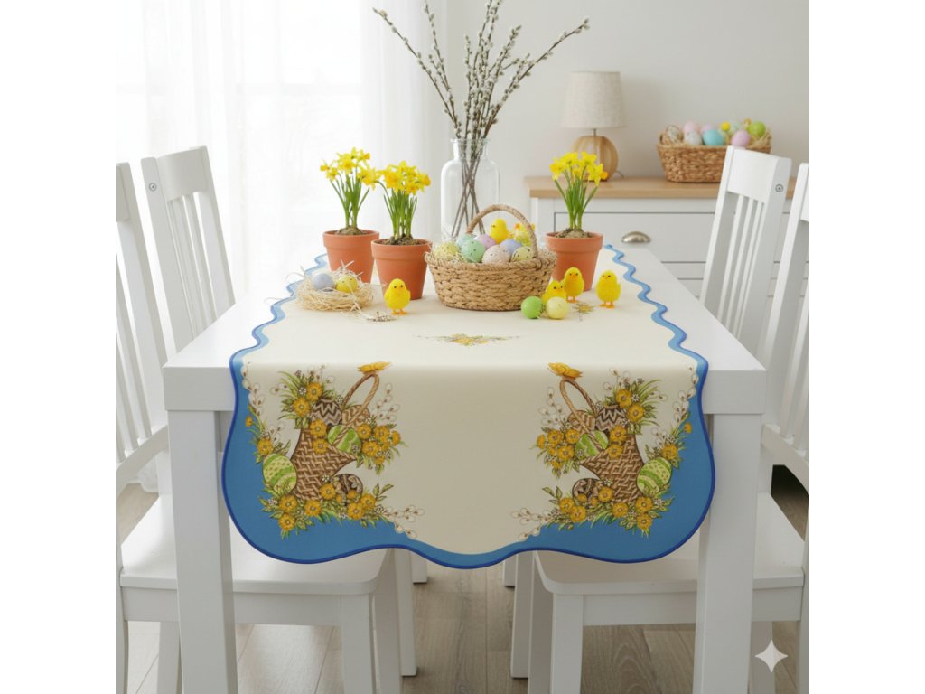 Velikonoční ubrus s motivem Jarního košíka s kuřátky vytvoří příjemnou atmosféru velikonočních svátků. Nádherné jarní barvy vnesou do Vašeho domova kousek slunce, elegance a radosti z nádcházejících svátků. Materiál 100 % polyester Barva materiálu: smetanováDoplňkové parametry